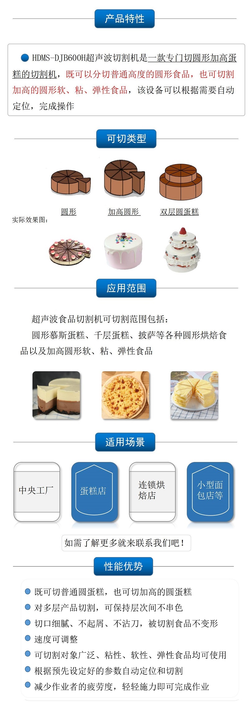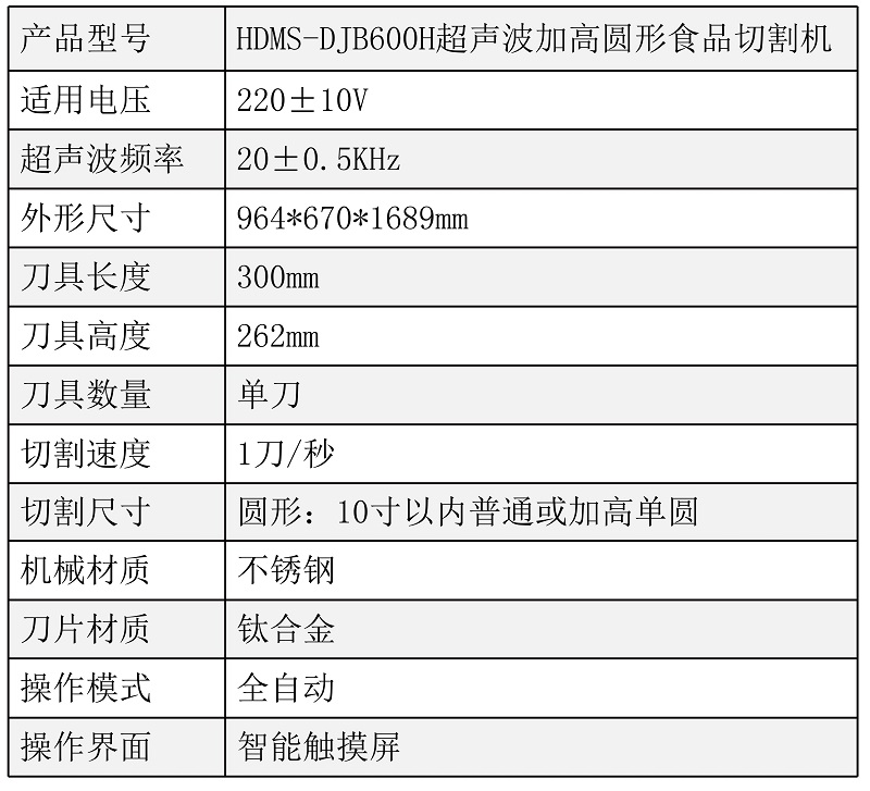 該設(shè)備配備單把超聲波刀片,可切圓形(只限一個(gè)圓蛋糕),也可切方形 |
